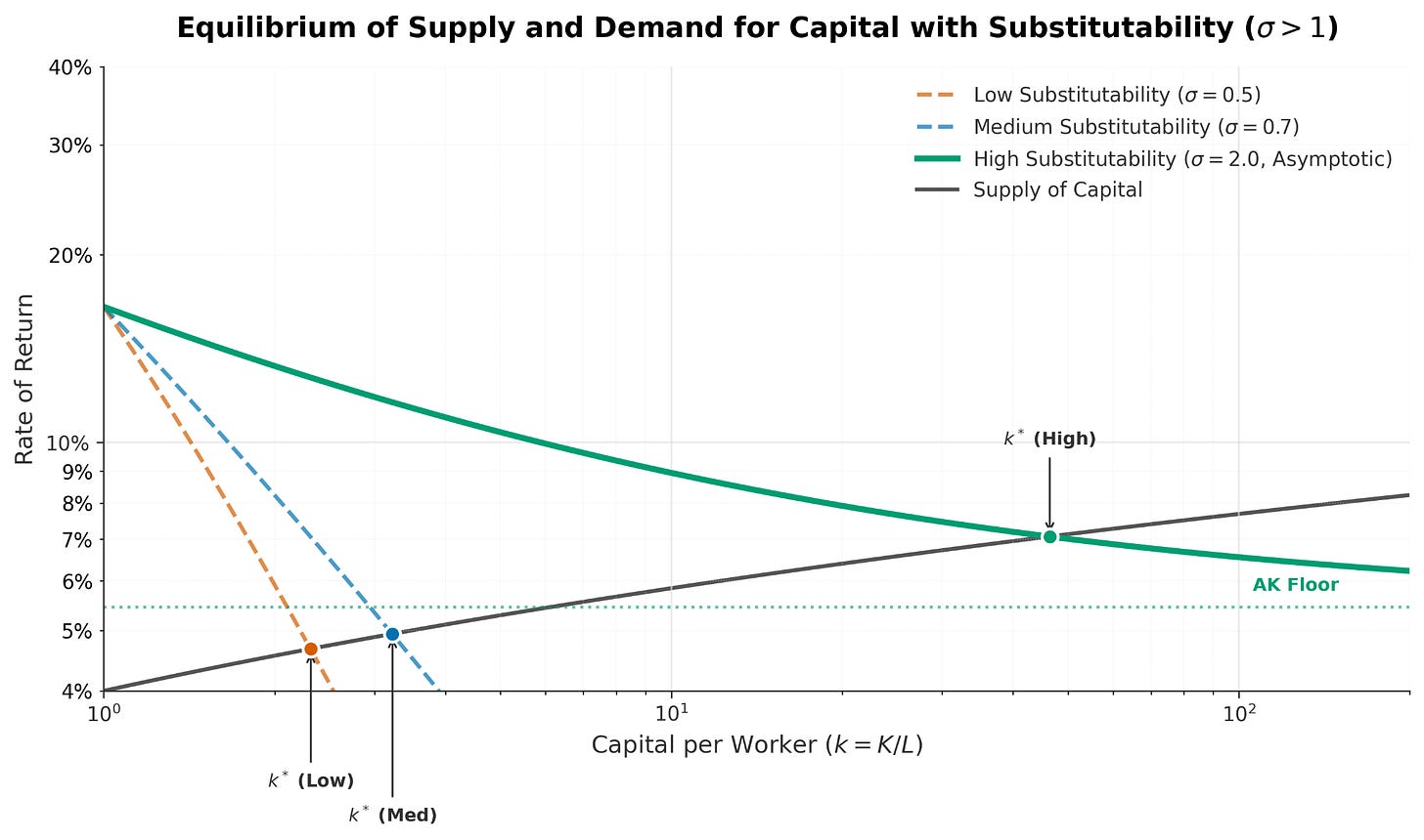The “robots building robots” story maybe implies η→1: self-replicating capital eliminates installation frictions. Investment translates directly into productive capacity without waste. This lowers the effective cost of capital accumulation, shifting the supply curve down and making unbounded growth more plausible. Notice is it bounded at 1.