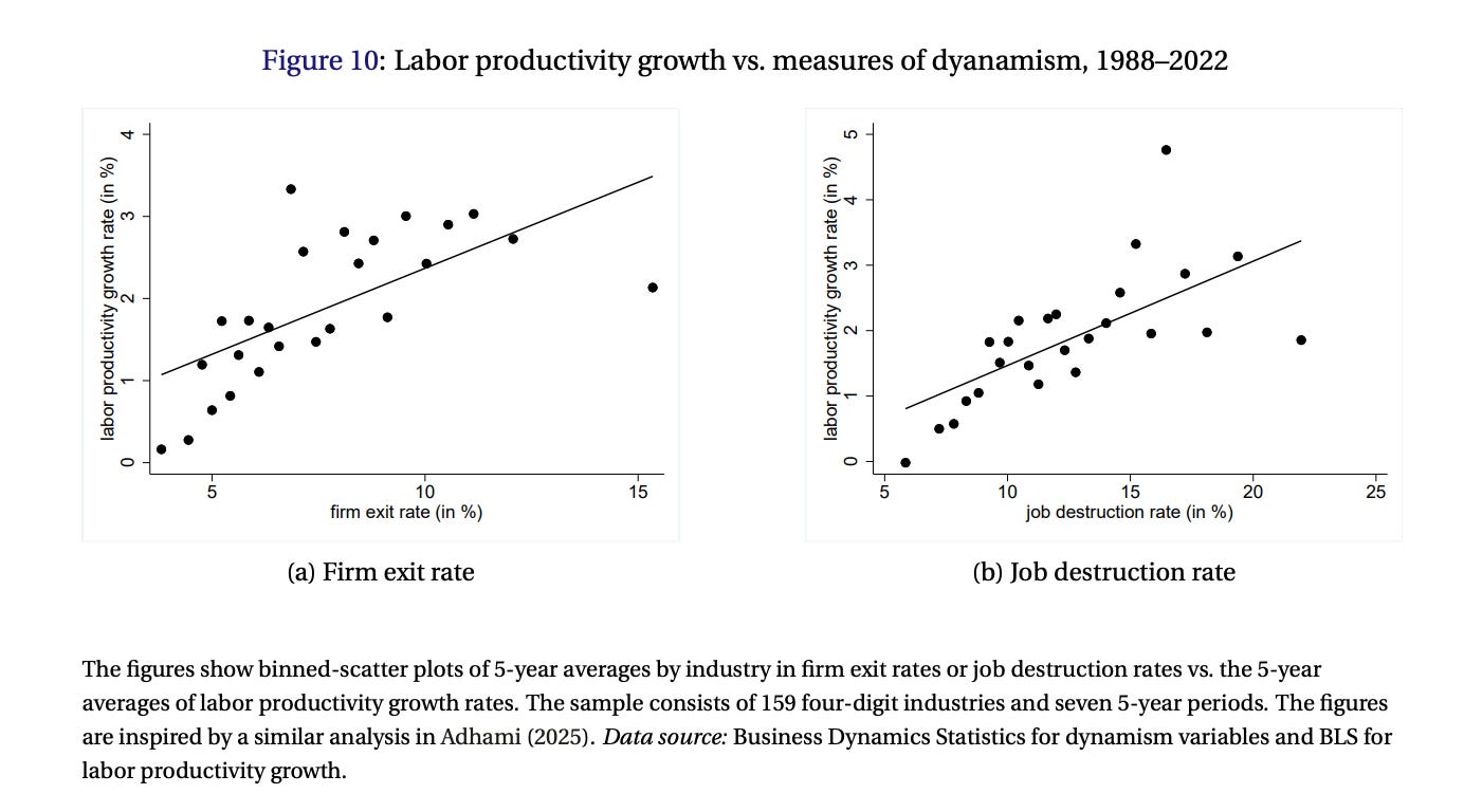 Taking Schumpeter seriously also changes how we think about competition, one of my favorite areas. Standard Econ 101 models wrongly imagine markets with stable sets of firms. Maybe new firms can enter, but we often treat the number of firms as fixed. That’s not remotely close to reality. We have immense churn. I’ve written elsewhere that this reallocation, creative destruction, is the essence of competition and how we should measure it.