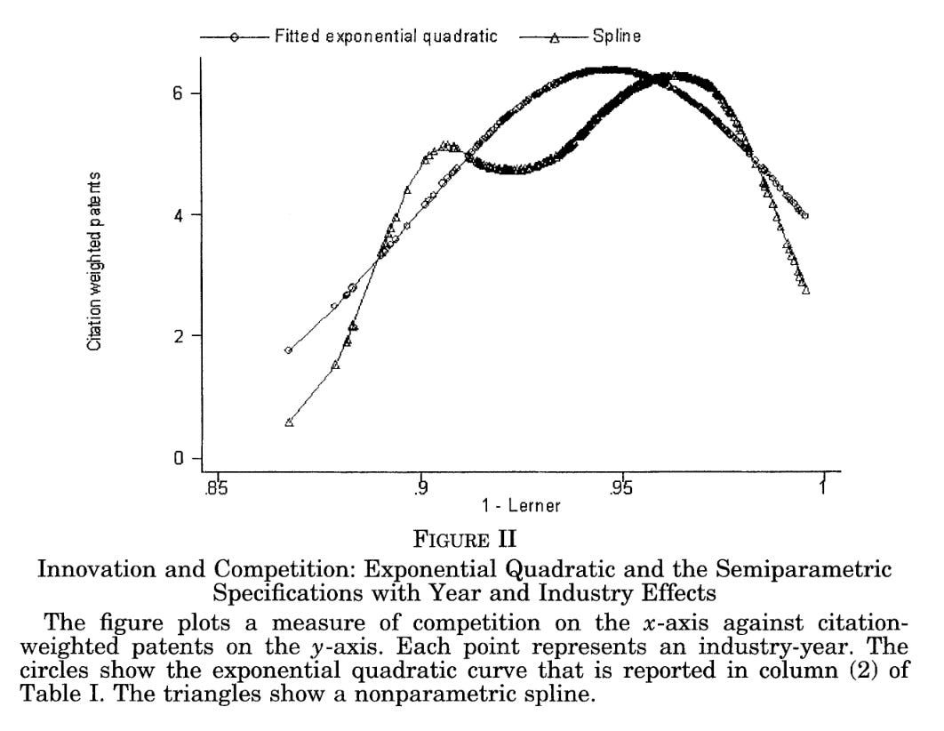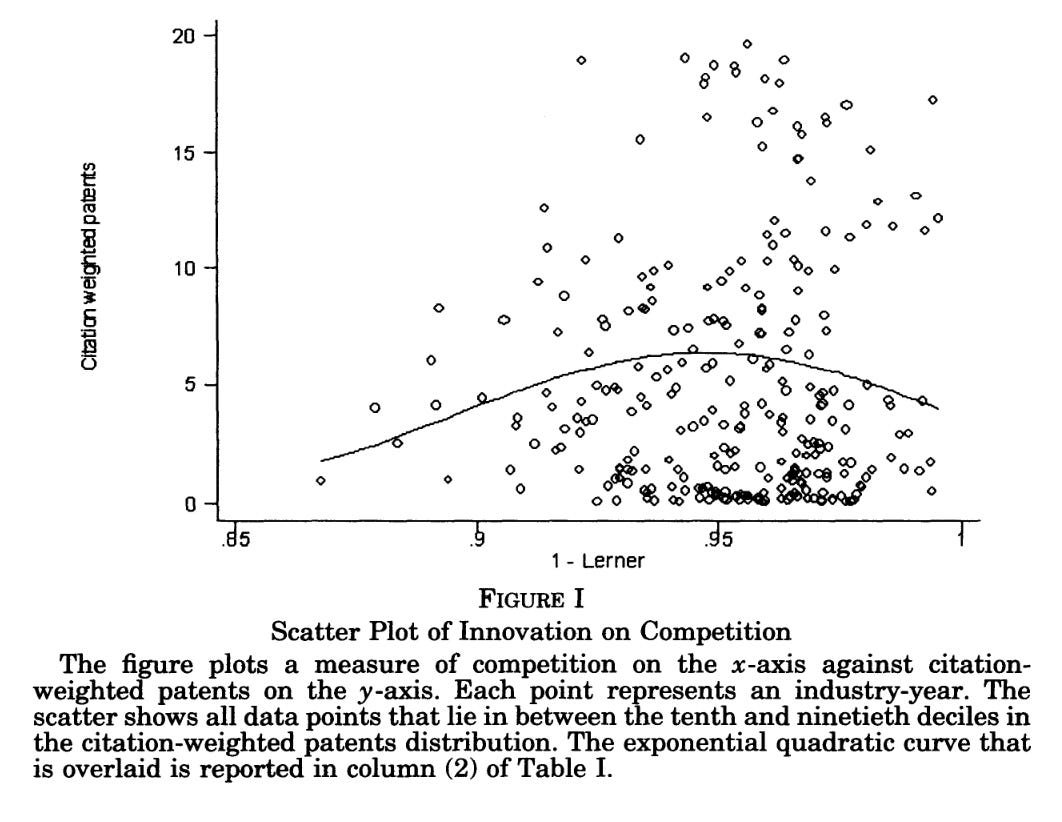 In follow up work, Aghion, Howitt, and co-authors showed the connection between innovation (connected to dynamsim but measured differently) and concentration level (their bad measure of competition) is an inverted U. A protected monopolist has no reason to innovate. Add some competition and firms innovate to escape their rivals—the “escape competition” motive kicks in. But make competition too intense and expected profits from innovation shrink so much that firms stop investing in R&D. Why bother if any breakthrough gets immediately copied? Aghion, Bloom, Blundell, Griffith, and Howitt found exactly this pattern in UK firm-level data.