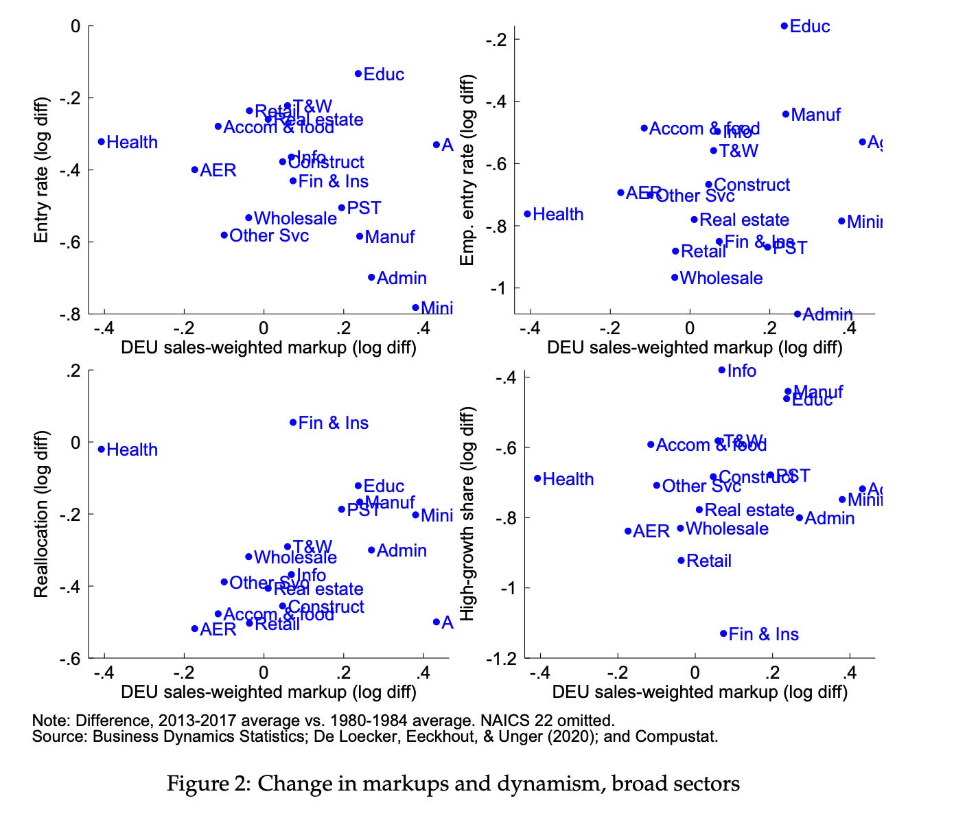 Looking quickly, by industry, at how markups have changed (x axis) and business dynamism changed (y axis), there isn’t a systematic relationship.