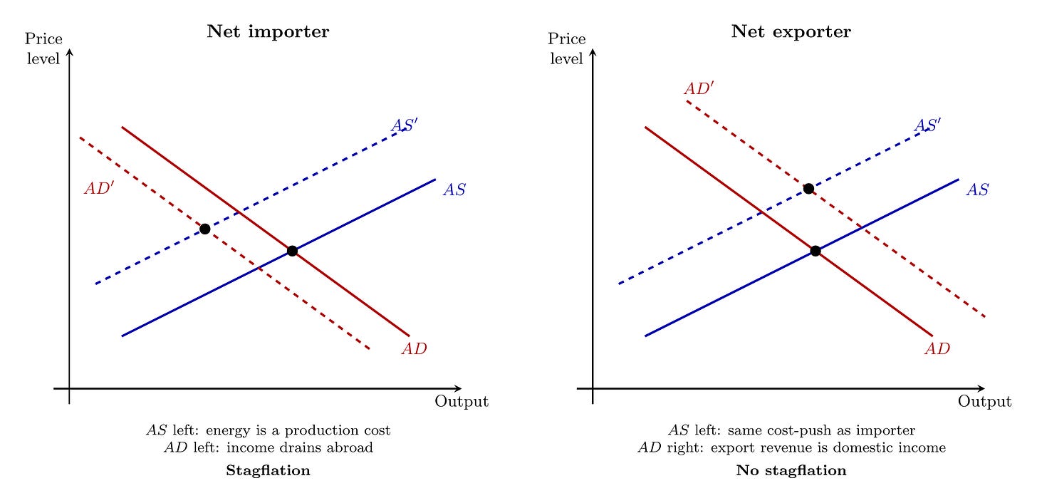 For a net exporter, we still have the AS shock left. Energy is still a cost of production, so there is cost-push pressure. But the export windfall raises income, which works the other way. You have a bigger inflation spike but less of an output fall.