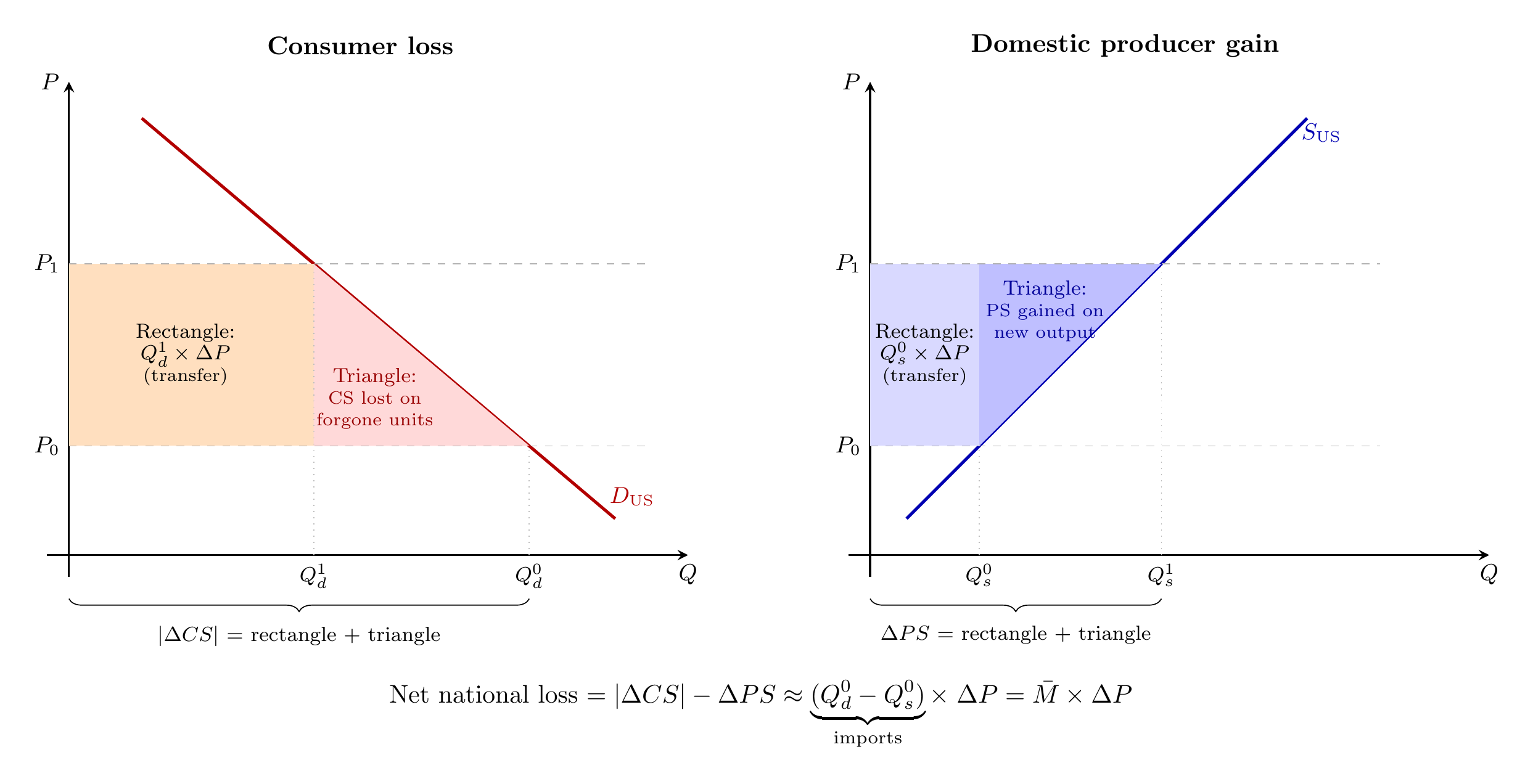 But we still have two offsetting triangles. So which way the bias runs. For a net importer, the quantity response shrinks imports: consumers cut back, domestic producers ramp up, and the country buys fewer foreign barrels. The rectangle calculated at the original import volume overstates the loss, because some of those barrels are no longer being purchased. The triangle correction makes the loss smaller.