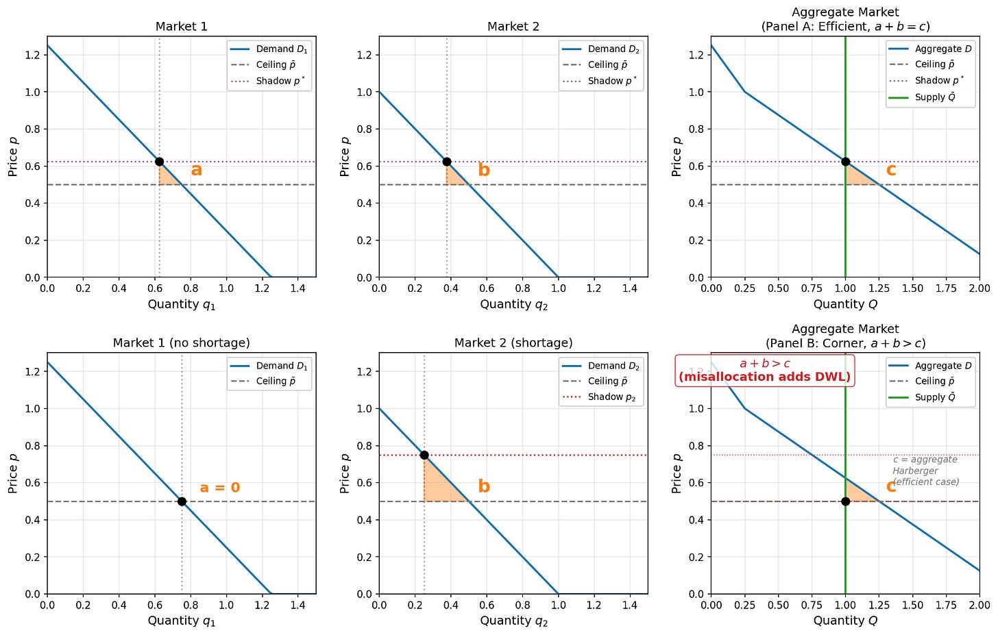 The top row is what every textbook draws: shadow prices equalize across markets, and the deadweight loss is the familiar Harberger triangle. The second row is what actually happens when cost minimization selects the allocation. One market gets everything it wants at the controlled price. The other gets whatever is left. The welfare loss in Panel B is nearly an order of magnitude larger than in Panel A. Same total supply. Same controlled price. The only difference is how that supply is distributed.
