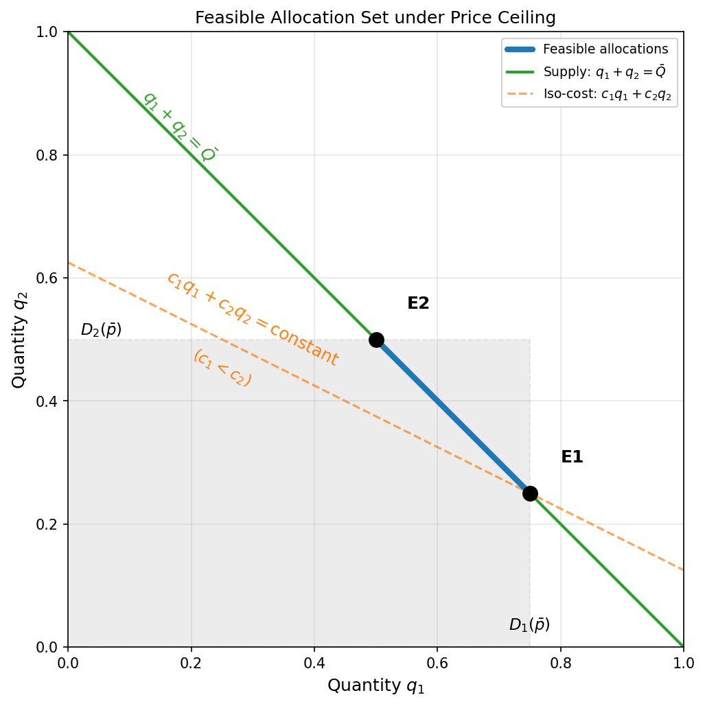 A bit of geometry makes this precise. The set of feasible allocations, all the ways you can divide a fixed total supply across markets, forms a shape with sharp corners. Under market prices, the objective (maximizing consumer surplus) is curved, so the optimum lands in the smooth interior. Under price controls, the supplier’s problem reduces to cost minimization, and cost is linear in quantity. A linear objective over a shape with corners always lands on a corner. Some markets get filled to capacity. Others get nothing. There is no “split the difference” outcome.