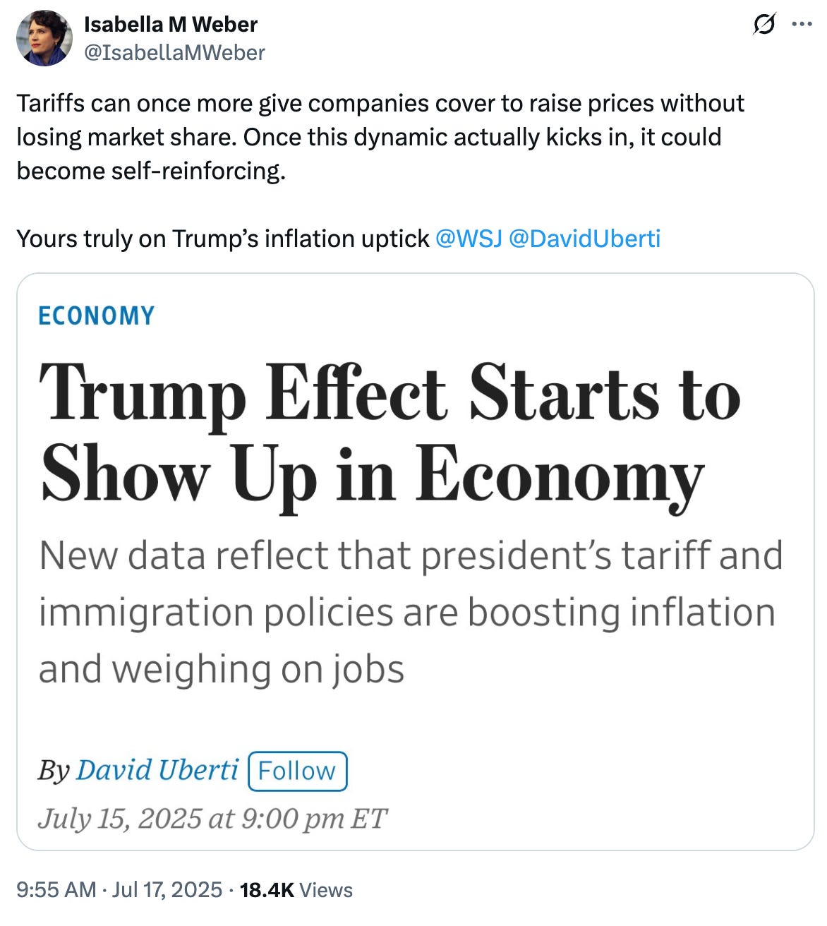 Weber’s sellers’ inflation theory predicts that tariffs—even the mere threat of them—enable firms to expand margins and increase profits through implicit coordination. I’d imagine all greedflation theories, to the extent they exist, would make the same prediction.